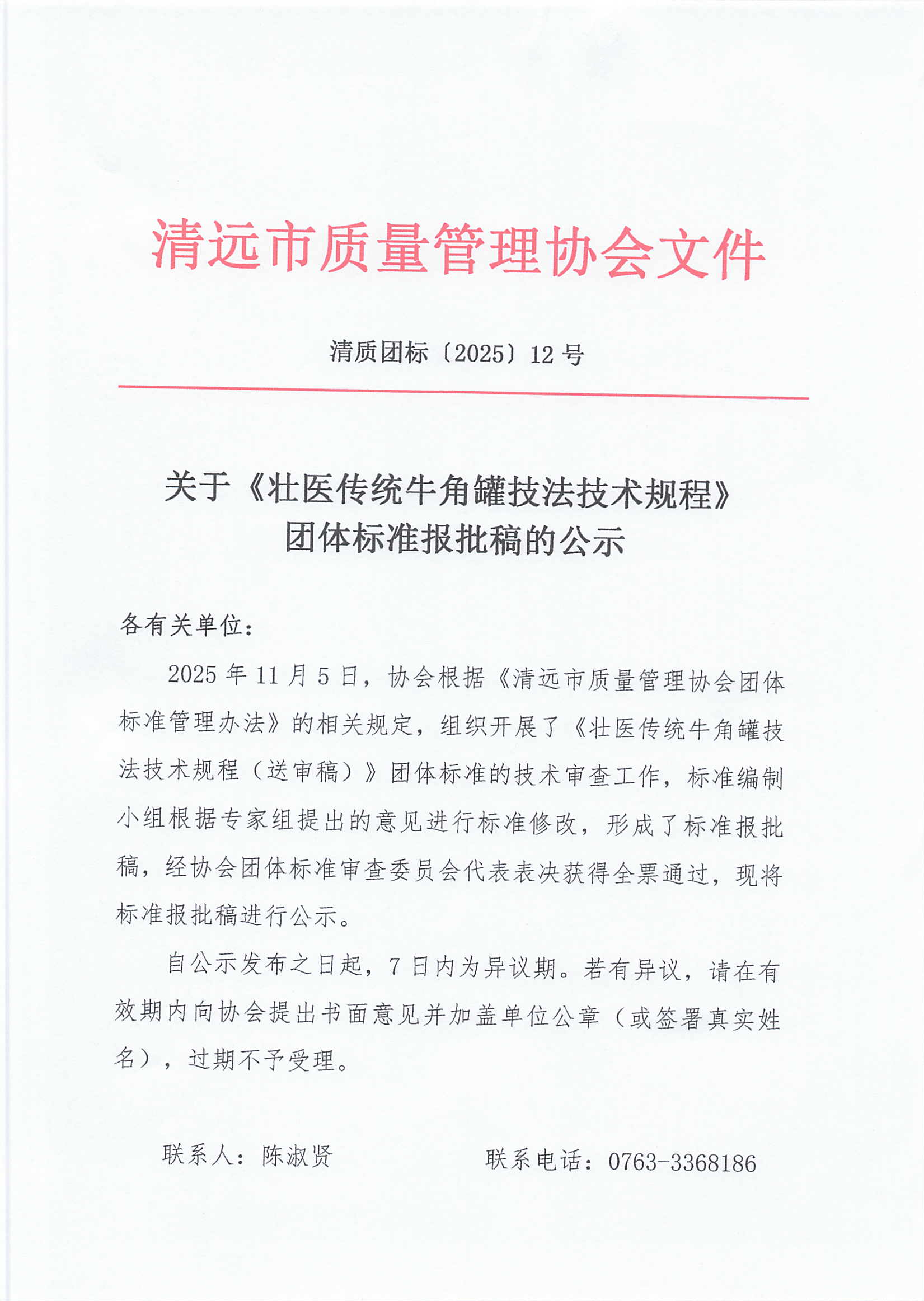 关于《壮医传统牛角罐技法技术规程》团体标准报批稿的公示