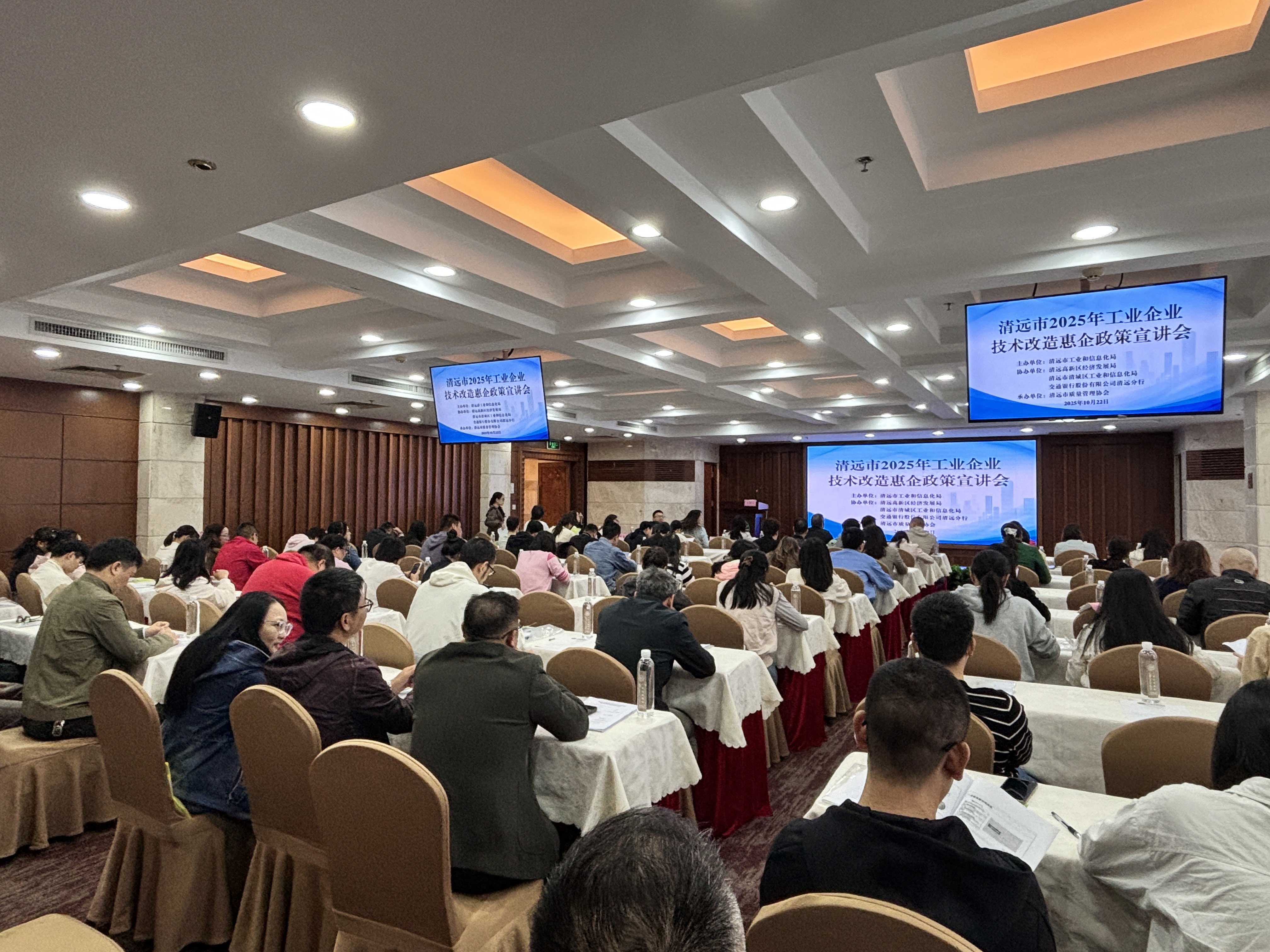 2025年10月22日上午,由清远市工业和信息化局主办,高新区经济发展局、清城区工业和信息化局、交通银行股份有限公司清远分行协办,清远市质量管理协会承办的清远市2025年工业企业技术改造惠企政策宣讲会-清城区、高新区专场在清远市丁香酒店二楼会议室顺利召开。清远市工业和信息化局党组成员、总经济师谢文琪,四级调研员温记全,科长范云倩,清城区工业和信息化局副局长肖洪坤,高新区经济发展局领导,清远市质量管理协会领导、专家及清城区、高新区企业代表近110人参加了会议。